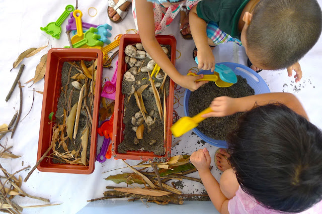 The Twig Box, Magnetic Field, and Farming Box were perfect for tactile and visual senses. They got curious kids digging for earth treasures like stones, twigs, and leaves. The rice field has metal nuts and bolts that has to be magnetized to be revealed. Picking and shoveling corn kernels make a farm bed for the animals.